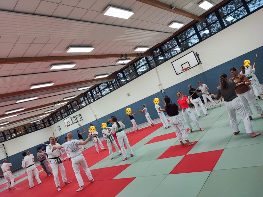 Nach Erläuterungen zur Waffe „Stock“ wurde die kurze Aufwärmphase grundtechnisch durch Führhand-Schulterkontakt vor- und rückwärtsgleitend mit Partner ergänzt. Dieses Warmup wurde dann mit einem ersten einfachen Stockdrill erweitert, den Jens gekonnt mit seinem Uke, Jelena Babica (diese hatte letztwöchig die Prüfung zum 1.Dan bestanden – herzlichen Glückwunsch) vorführte.
